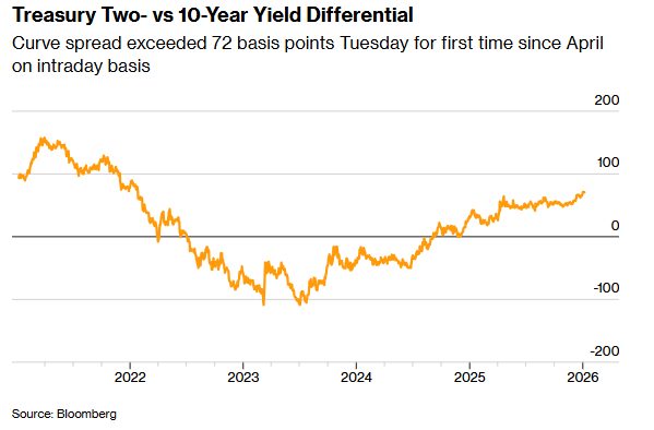 当然,尽管整体波动有限,但本周美国国债市场仍逼近一个关键里程碑——10年期美债收益率相对于两年期美债收益率一度达到了近九个月来的最高水平,这表明交易员押注美联储将在2026年进一步降息。