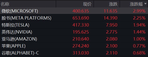 美股“七巨头”全线拉升,推动大盘走高,万得美国科技七巨头指数上涨1.44%。个股方面,微软涨近3%,脸书涨超2%,特斯拉涨近2%,英伟达涨超1%,亚马逊涨1%,苹果涨0.77%,谷歌涨0.68%。